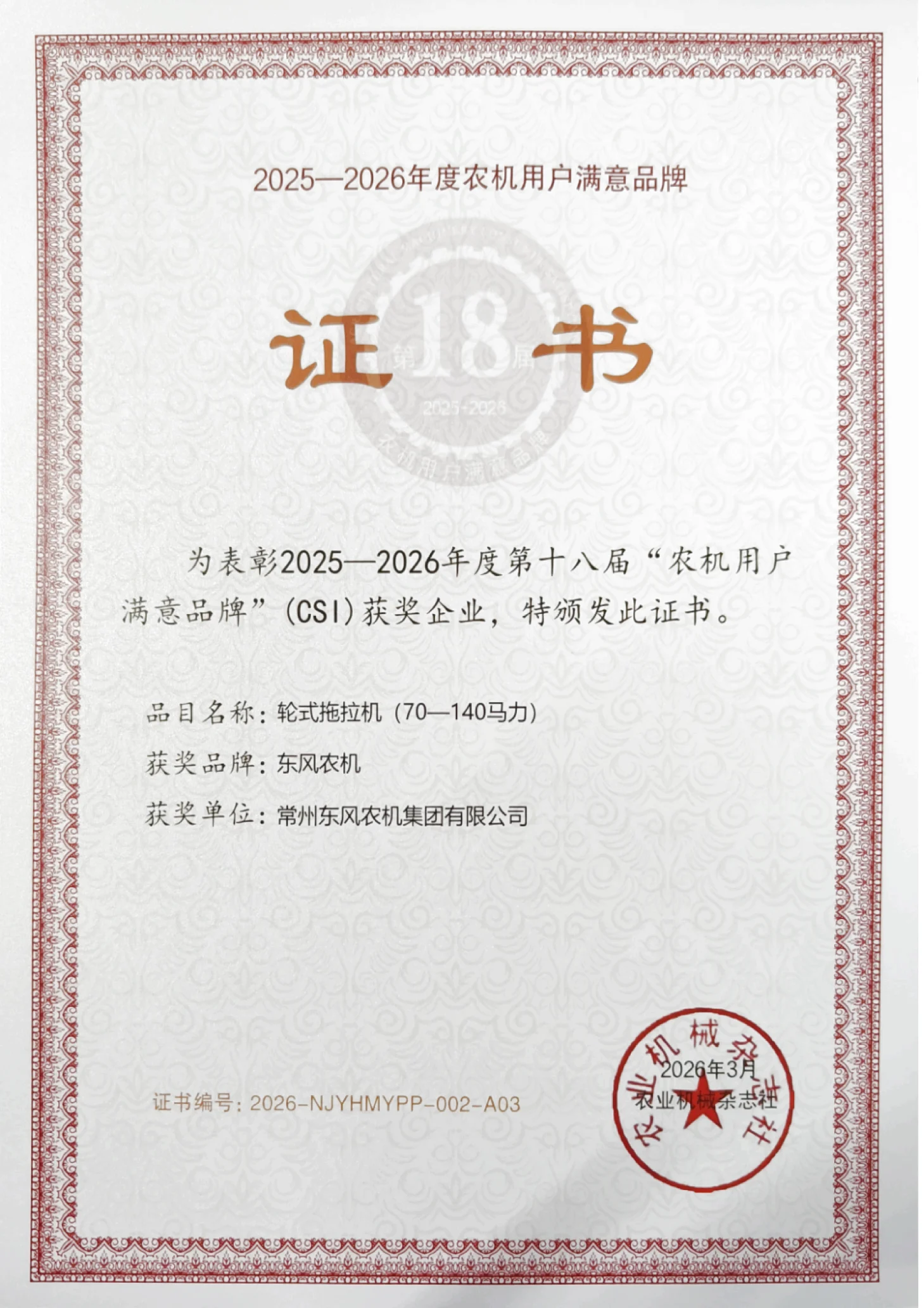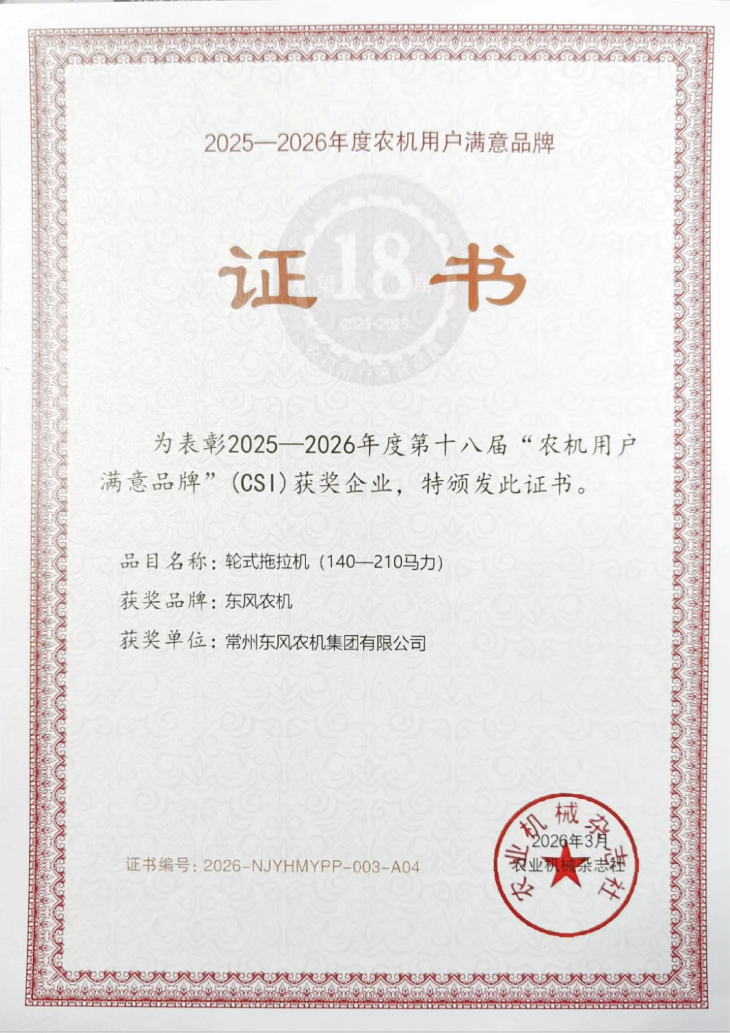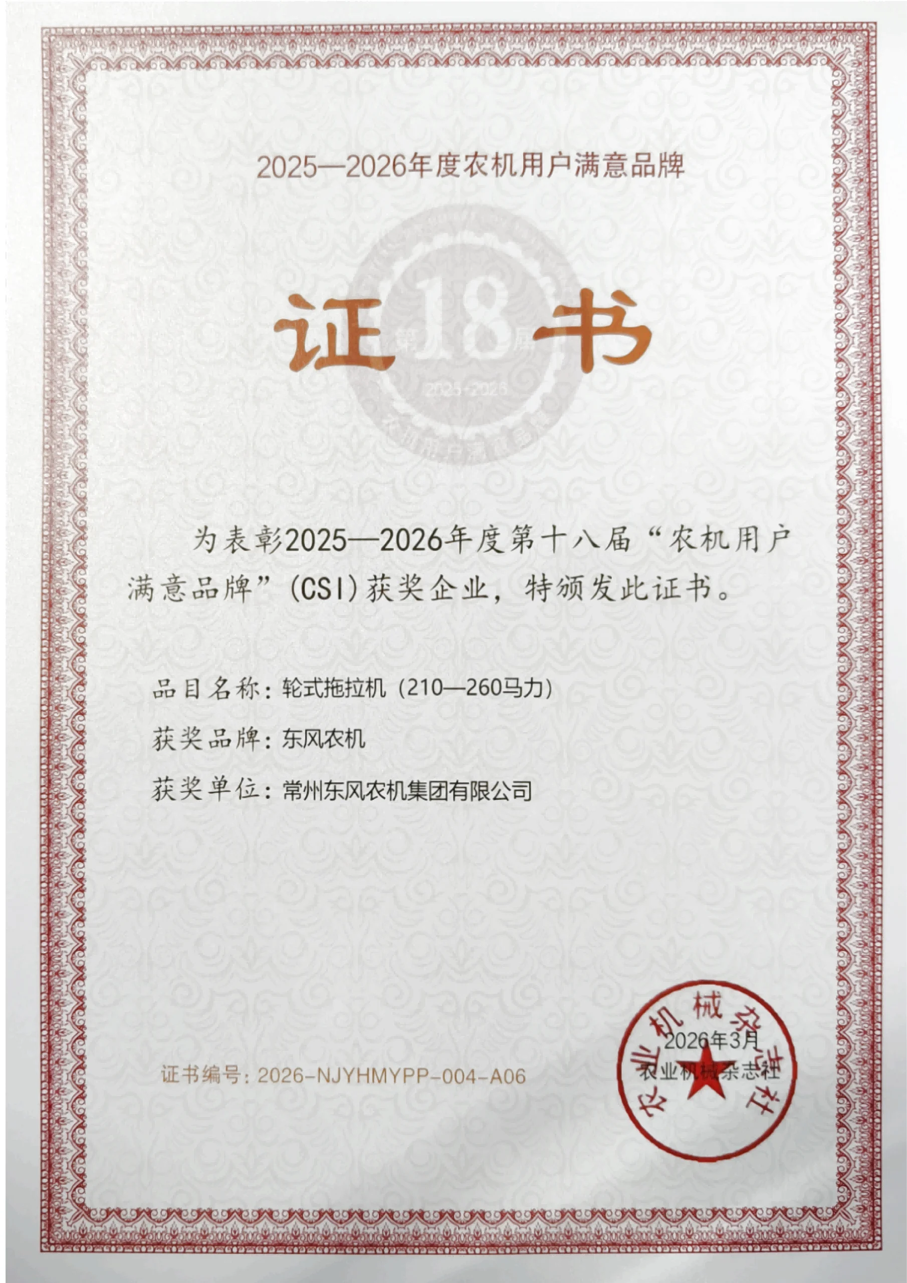 2026年3月13日,由农业机械杂志社、中国农业机械学会普及工作委员会、中国包装和食品机械有限公司共同承办的第四届农机品牌大会暨第18届农机用户满意品牌发布及颁奖活动在浙江永康举办。东风农机凭借硬核的产品实力、完善的服务体系与超高的用户认可度荣获“第十八届全国农机用户满意品牌” 四项大奖。